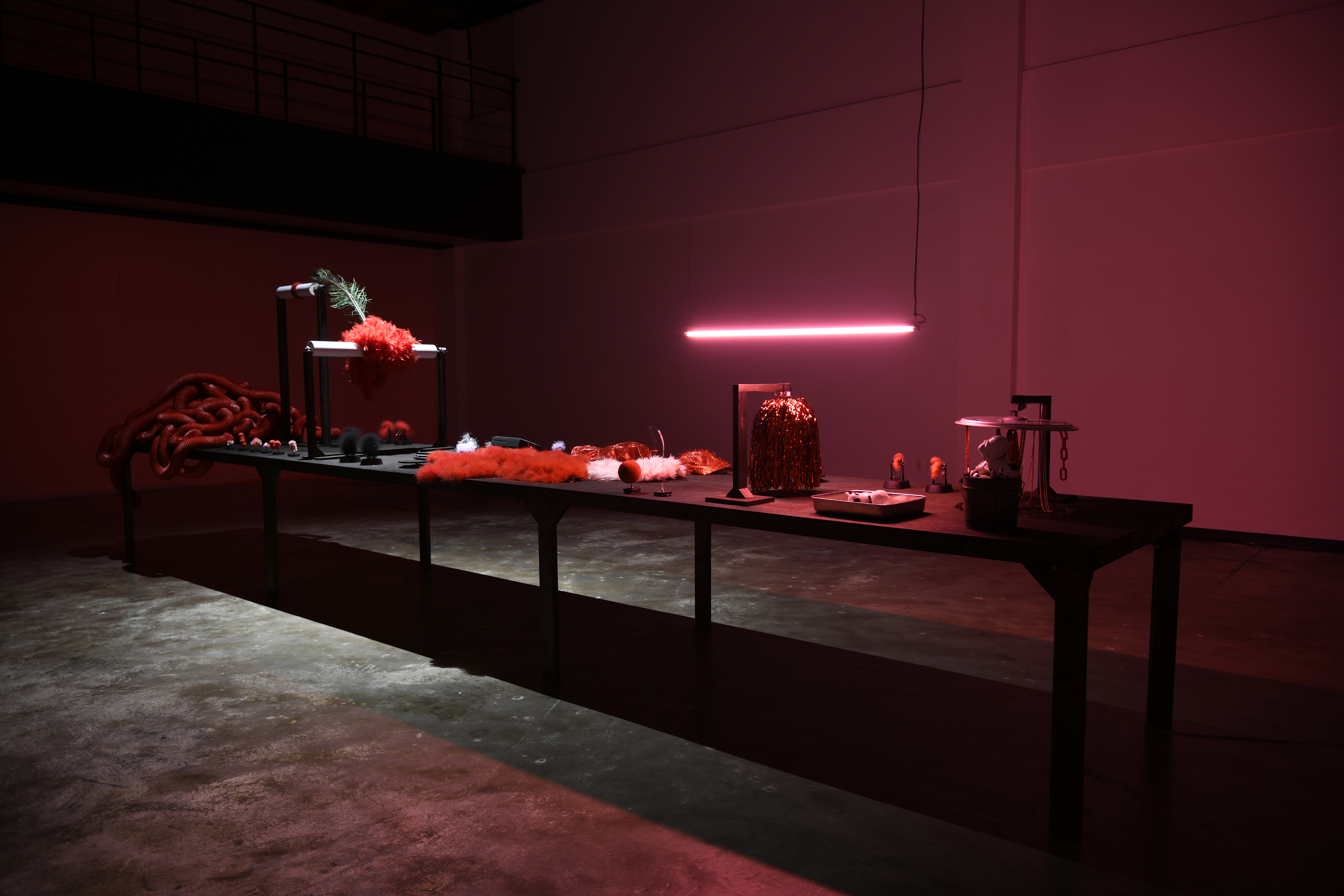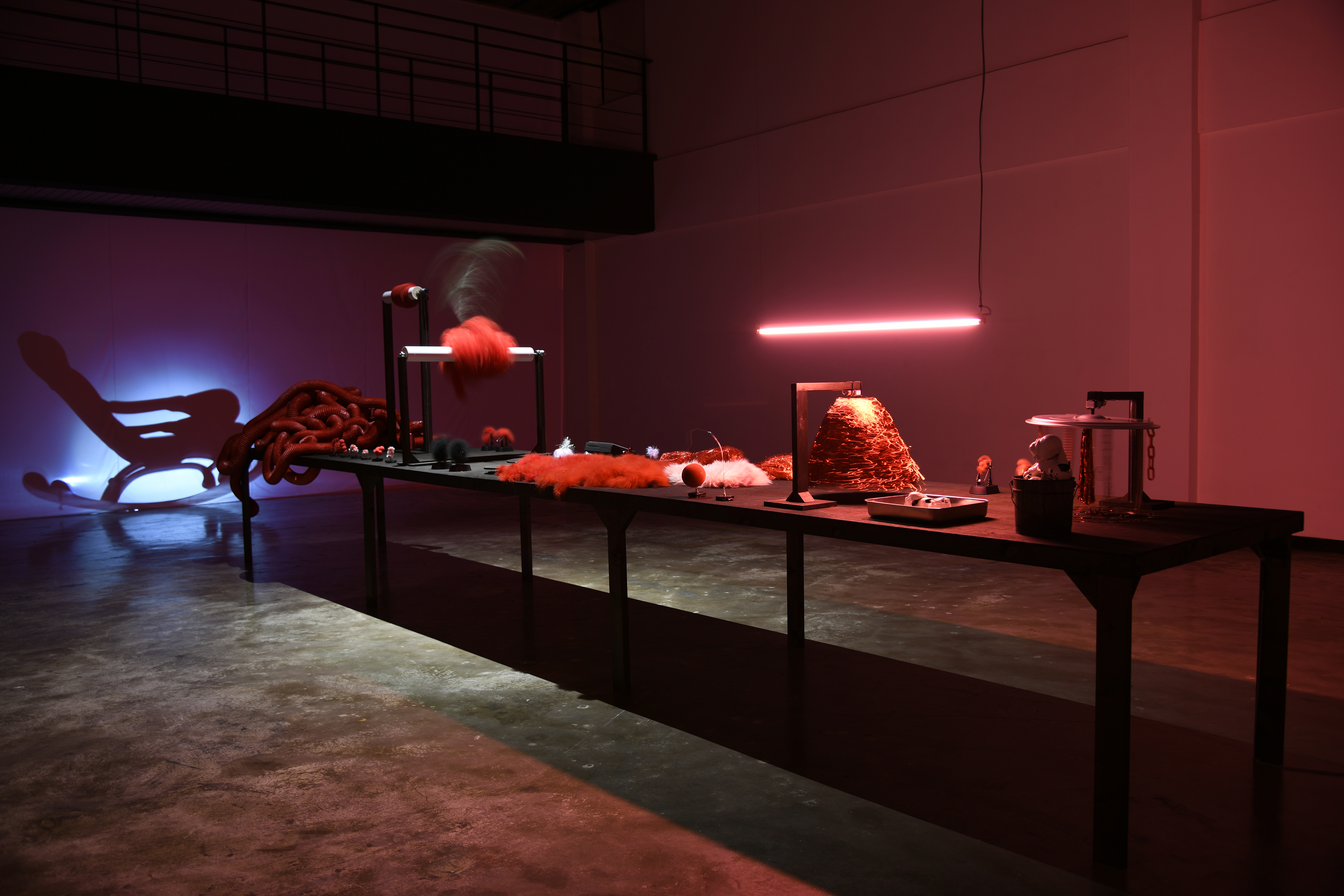 :키네틱 작업의 연구를 위한 본인의 작업 테이블을 제작. 다양한 실험들을 나열하여 전시하였다.